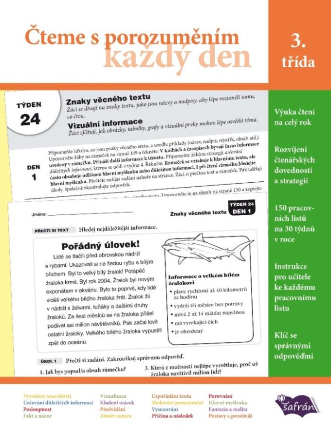 V této publikaci najdete 150 pracovních listů, z nichž každý obsahuje krátký podnětný text pro třeťáky a sadu otázek rozvíjejících porozumění textu. Otázky s výběrem odpovědí míří na čtenářské dovednosti (např. vysuzování, rozpoznání příčiny a následku, odhalení záměru autora), otevřené otázky rozvíjejí čtenářské strategie (kupř. sledování porozumění, kladení otázek, vizualizace). Ke každému dni jsou v publikaci instrukce pro učitele – metodická podpora, která vám usnadní přípravu na výuku. Správné odpovědi na otázky a zadání naleznete v klíči.